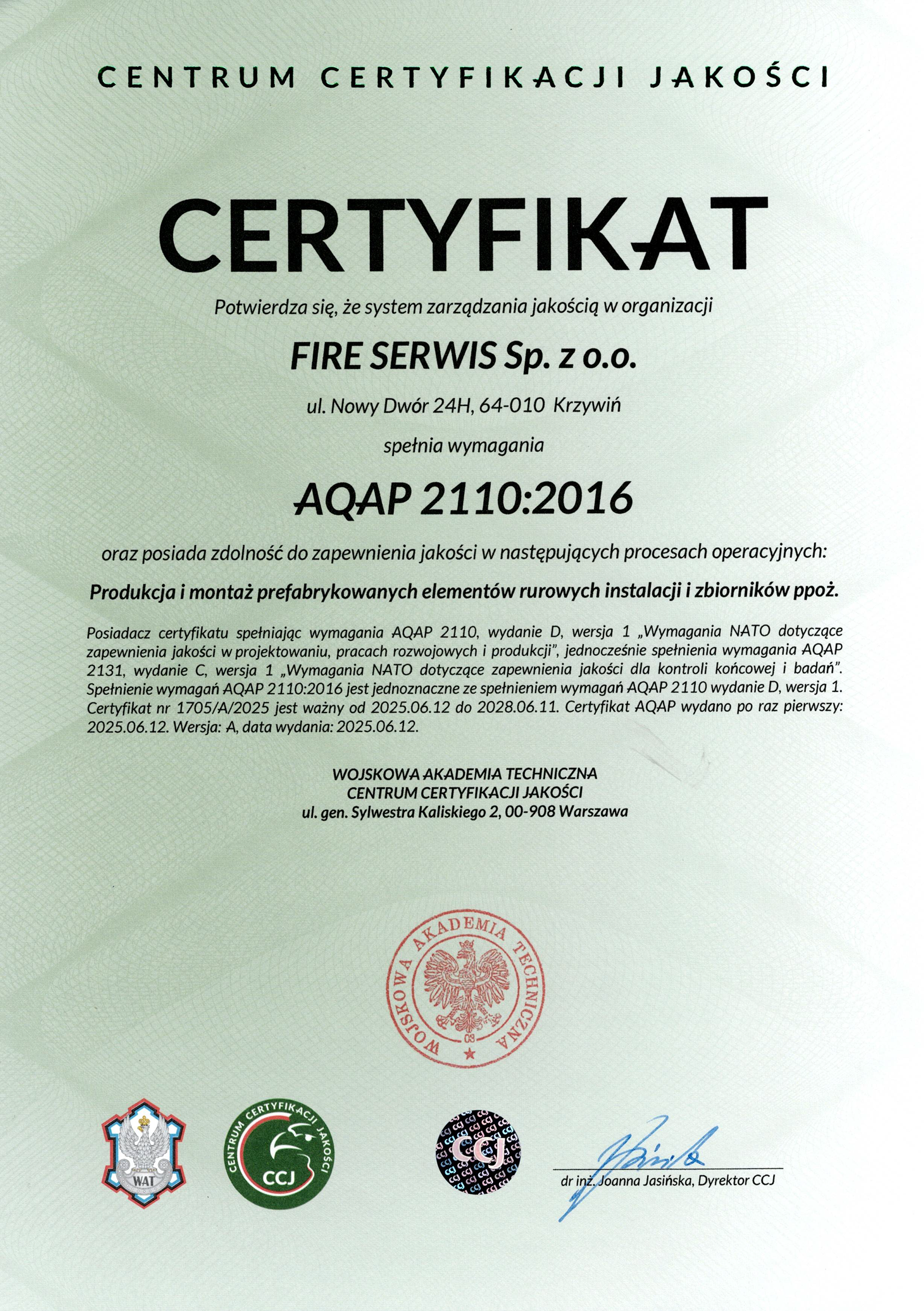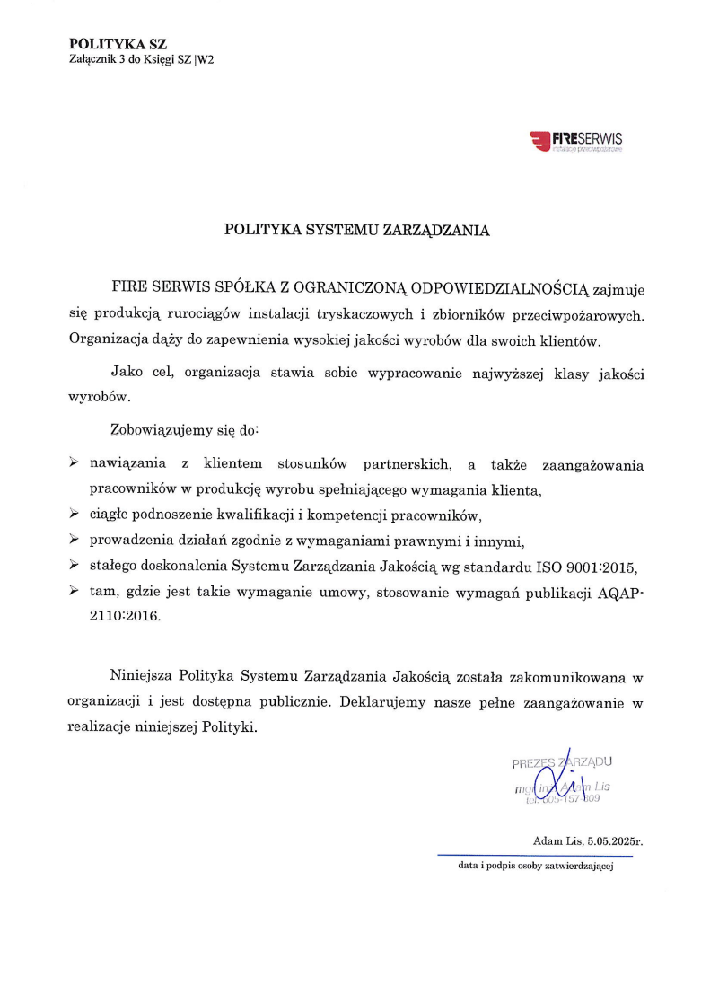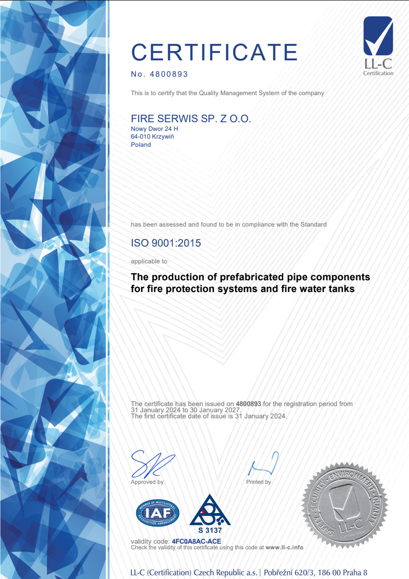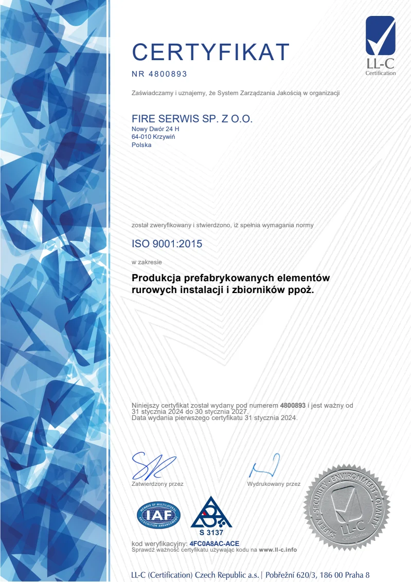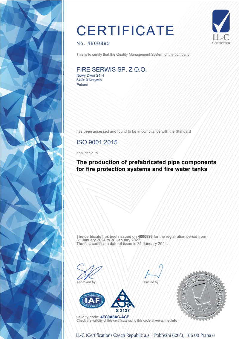 Posiadamy certyfikaty w zakresie produkcji prefabrykowanych elementów rurowych instalacji i zbiorników ppoż.